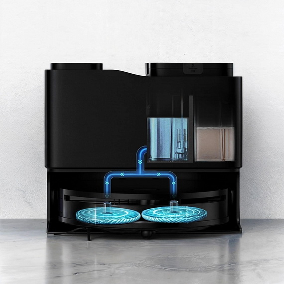 Робот оснащен баком с водой, что позволяет постоянно поддерживать влажность мопов и удалять с них грязь. В зависимости от степени загрязнения робот возвращается на базу и промывает мопы чистой водой, чтобы улучшить результат уборки и избежать разводов (период полоскания можно настроить). Промывка осуществляется под высоким давлением, что экономит воду на 30% и обеспечивает качественную очистку мопов.