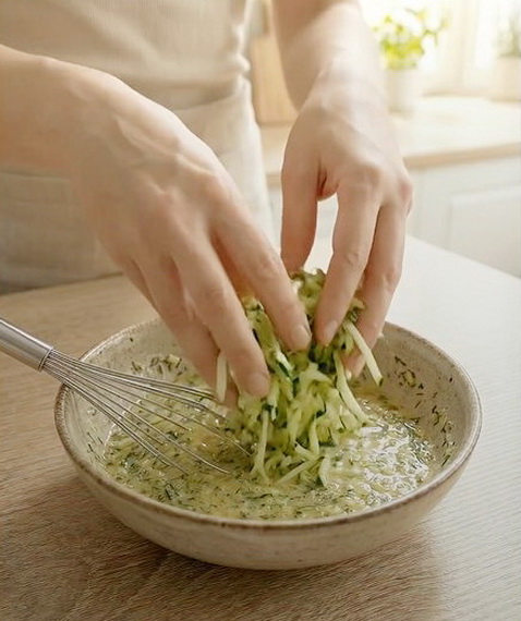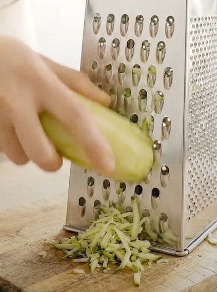 Натрите кабачок на мелкой тёрке, посолите, отожмите.