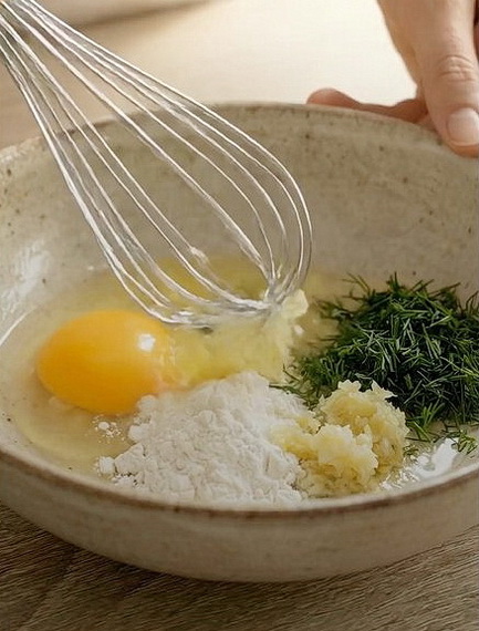 Смешайте яйцо, рисовую муку, тёртый чеснок, измельчённый укроп.