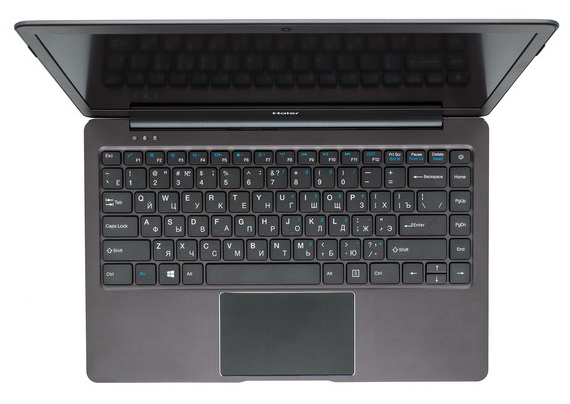 Среди других достоинств новинки от Haier отметим чувствительный тачпад и клавиатуру с пластиковыми клавишами островного типа – она не имеет подсветки и цифрового блока, но зато с правой стороны на ней есть дополнительный столбец, включающий клавиши Home, Page Up, Down и End.