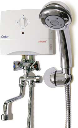Сегодняшний рынок предлагает широкий выбор проточных нагревателей воды. Например, водонагреватель BIAWAR серии Oskar (рис. 1) имеет номинальную мощность 5,5 кВт и потребляет ток 25 А. Прибор снабжен фильтром очистки воды от механических загрязнений и антистатическим корпусом из ABS-пластика. На передней панели водонагревателя расположен регулятор мощности. Такой прибор может одновременно питать несколько точек потребления воды. В зависимости от модели, приборы серии Oscar комплектуются смесителем, душевой лейкой или и тем, и другим одновременно (комби).