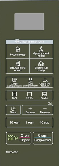 Пожалуй, наиболее интересная для любой хозяйки особенность новых микроволновых печей LG – удобные наборы автоматических программ приготовления «Кухни Мира». С их помощью вы можете без труда приготовить традиционные блюда французской, итальянской, восточной и русской кухни. В моделях с грилем насчитывается 44 автоматические программы, в моделях без гриля – 32 программы.