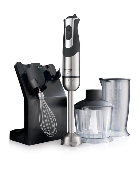 Этот мультифункциональный прибор, хотя и числится погружным блендером, но, по сути, представляет собой компактный кухонный комбайн, совмещающий функции миксера, измельчителя, мультирезки и мясорубки. В его комплект входит шесть насадок: насадка-блендер, насадка-венчик, насадка-измельчитель, насадка-терка, насадка-терка для измельчения и насадка-шинковка.