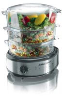 Если говорить о прочих характеристиках пароварок, то следует обратить внимание на размер поддона, в котором скапливается отработанный пар – конденсат (обычно в ходе варки получается бульон, который можно использовать для приготовления соусов). Он должен быть достаточно вместительным, глубиной не менее 1,5 см, а еще лучше 2…2,5 см. Если поддон неглубок, вам придется постоянно следить за его наполнением и периодически выливать образовавшийся конденсат, чтобы он не попал на нагревательный элемент, при этом приостанавливая работу пароварки. У большинства пароварок поддон для сбора конденсата всего один, а значит, если одновременно готовится несколько блюд, то продукты в нижних паровых корзинах пропитаются соком продуктов, расположенных выше. Многих хозяек это устраивает, кто-то даже любит, чтобы овощи пропитывались мясным бульоном, но все-таки иногда приходится задумываться о совместимости блюд и вкусов, особенно когда в семье кто-то является вегетарианцем или вынужден соблюдать диету. В таком случае лучше все же выбирать пароварки с несколькими поддонами под каждую чашу.