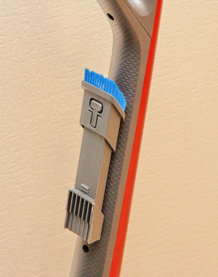 Эргономичная ручка Easy Grip уменьшает нагрузку на область запястья руки, что немаловажно, раз уж пылесосом можно работать достаточно долго. Впрочем, при необходимости из основного блока можно извлечь ручной пылесос, под брюшком которого скрыта складная щеточка, и выполнить «точечную» уборку там, куда не дотянуться основной насадкой.