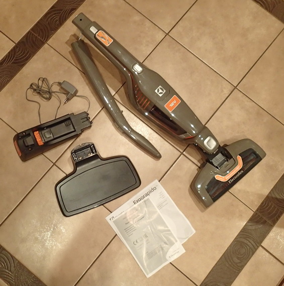 В 2014 году компания Philips представила мини-серию из двух беспроводных вертикальных пылесосов – PowerPro Duo FC6162 и FC6168. Один из них и оказался нашим гостем. В коробке обнаружился собственно пылесос, состоящий из двух частей, которые связаны «пуповиной» электрического провода (верхняя часть вставляется в нижнюю и скрепляется винтом, для затяжки которого, при отсутствии отвертки, можно воспользоваться монеткой), зарядного устройства с набором для крепежа на стене, а также комбинированной щеточки для съемного ручного пылесоса.