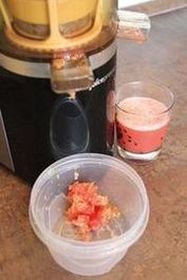 Опробовать соковыжималку в работе мы решили на нескольких видах фруктов – как раз тех, чья деликатная мякоть не слишком хорошо переносит отжим в приборах традиционного типа. Виноград, томат, рассыпчатые антоновские яблоки, смесь черной и красной смородины – передать словами прекрасный вкус полученных соков мы, конечно, не сможем, но зато на приведенных фотографиях виден высокий выход сока и количество полученного жмыха (во всех случаях весьма скромное).