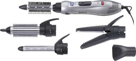 В арсенал «навесных орудий» этого прибора входят насадка-концентратор, круглая щетка с убирающимися зубьями для автоматического освобождения локонов диаметром 30 мм, и круглая щетка диаметром 20 мм, выпрямитель волос и насадка для создания локонов.