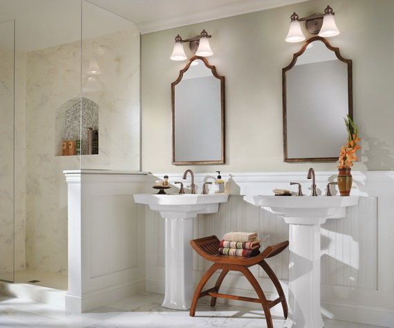 Ванная комната также требует тщательно продуманного освещения, ведь речь идет о личной гигиене и уходе за собой. Слишком часто в ванной монтируют центральный потолочный светильник, который отбрасывает тени на человека, стоящего перед зеркалом. Одним из лучших решений является освещение обеих сторон зеркала. В небольших ваннах, где, возможно, придется выбирать между настенным креплением со стороны зеркала или подвесным светильником, дизайнеры советуют выбрать размещение на стене. В традиционном сценарии предусмотрите центральный потолочный светильник, а также светильник над зеркалом. А для больших ванных комнат запланируйте два «бра» с обеих сторон зеркала и третье, поярче, на противоположной стене – только ни в коем случае не напротив зеркала.