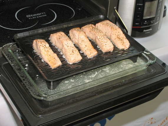 Чтобы продемонстрировать возможности новой инверторной печи Panasonic, мэтр приготовил рыбу на пару. В этом режиме микроволны не используются, а перед началом работы нужно наполнить водой контейнер…