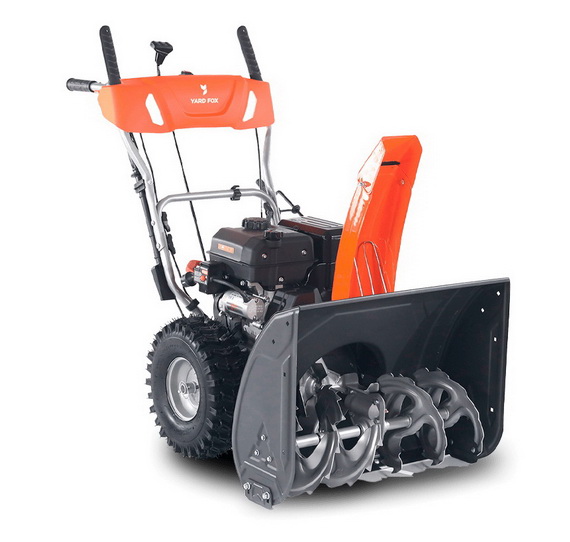 Бензиновый снегоуборщик YARD FOX BASIC 6652E оборудован прочным стальным двухступенчатым шнеком и металлическим желобом. Самоходная колёсная база с фрикционной трансмиссией и передачами (шесть вперед и две назад) делает управление плавным даже на неровной поверхности. Электростартёр от сети 220 В ускоряет запуск в холод, а ручной вариант добавляет надёжности.