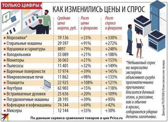 Недавно «Комсомольская правда» сообщила интересный факт: рост спроса на морозильные лари в марте этого года составил 330% по отношению к февралю (по данным сервиса сравнения товаров и цен Price.ru). Эксперты издания объясняют небывалый рост спроса сугубо прагматичными причинами: близится дачный сезон и россияне, как обычно в кризис, собираются ударно делать заготовки овощей, грибов ли ягод.
