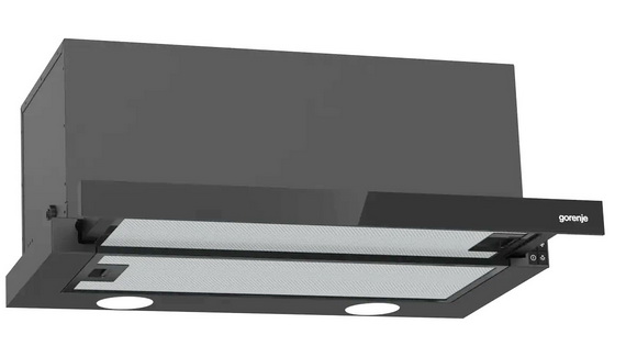 Телескопическая вытяжка Gorenje TH60E7GB полностью встраивается в навесной кухонный шкаф. Внизу остается на виду только выдвижная панель, за которой с правой стороны расположена панель управления. Модель способна работать как в режиме отвода воздуха, так и в режиме рециркуляции. В первом случае требуется монтаж воздуховода, соединяющего вытяжку с вентиляционной шахтой, во втором – дополнительная установка (и приобретение) угольного фильтра, способного улавливать неприятные запахи и вредные продукты горения.