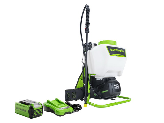 Эффективным помощником при проведении этих работ будет аккумуляторный опрыскиватель Greenworks GSP1250K4. Устройство работает от Li-Ion аккумулятора с напряжением 24 В, его бак объёмом 7,5 л закрепляется на спине как рюкзак.