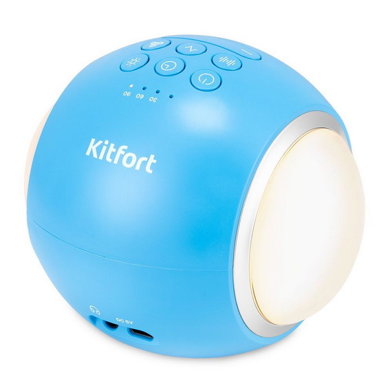 Kitfort КТ-3757 – генератор белого шума со спектром частот от 150 до 20000 Гц. Помимо генерации звука, он выполняет функцию ночника с возможностью включения цветной подсветки. При помощи кнопок на корпусе можно настроить таймер (от 30 до 90 минут) или задать непрерывный режим работы, установить один из трёх уровней подсветки и выбрать воспроизводимый прибором звук (белый шум, вентилятор или естественные звуки).