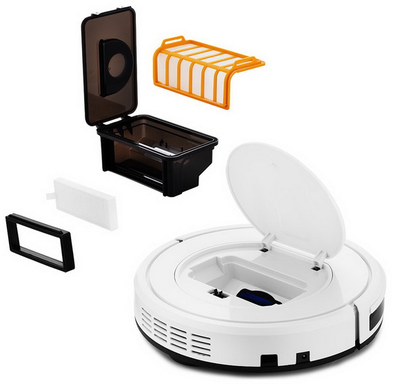 В комплект модели входит всё необходимое для уборки: пылесборник, боковые щётки, пульт ДУ, фильтр грубой и тонкой очистки, база, зарядное устройство и щёточка для очистки.