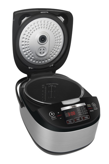 Модель Midea MPC-6020 поставляется в комплекте с мерным стаканом, контейнером для приготовления на пару, половником и ложкой. Мультиварка поддерживает 11 автоматических режимов, в том числе «Суп», «Паста», «Тушение» и «Выпечка». По завершении выбранной программы устройство подает звуковой сигнал. Для выбора настроек и включения таймера на передней панели есть жидкокристаллический дисплей и сенсорные кнопки. Встроенный влагосборник исключает оседание конденсата на внутренних стенках и крышке.