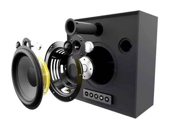 Колонка в демпфированном корпусе имеет качественную внешнюю отделку и комплектуется съемной защитной сеткой (доступна в четырех цветах – черном, белом, синем и красном). Стереосистема выполнена в конфигурации 2.1, что является оптимальным с точки зрения широты звуковой картины и качества басов для моделей данного типа. В колонке установлены 6-дюймовый низкочастотный динамик и два 1-дюймовых твитера – все излучатели изготовлены в точном соответствии со спецификациями, требуемыми для получения наиболее качественного звука.