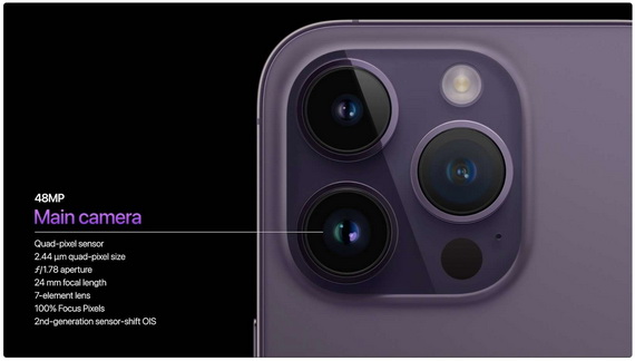 Камера в iPhone 14 Pro и 14 Pro Max мощно улучшилась: ее разрешение 48 мегапикселей, а новый квадропиксельный сенсор захватывает до двух раз больше света, чем в iPhone 13 Pro.