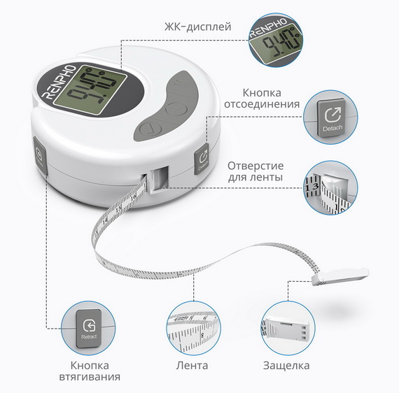 Контролировать объем талии можно с помощью умной электронной рулетки Renpho Smart Tape Measure R-Y001. Разработанный для измерения длины и обхвата частей тела, этот гаджет с ЖК-дисплеем подходит тяжелоатлетам, бодибилдерам и спортсменам для отслеживания процента мышечной массы.