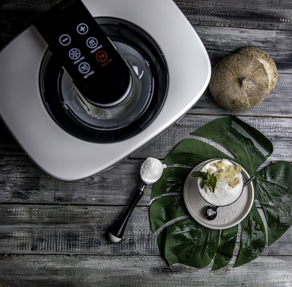 На верхней части корпуса из нержавеющей стали расположена панель управления с цифровым дисплеем и индикаторами, кнопками выбора необходимых параметров. Окошко в крышке позволяет вводить добавки и наполнители в процессе работы прибора, а прочные прорезиненные ножки предотвращают скольжение и обеспечивают устойчивое положение мороженицы на горизонтальной поверхности.