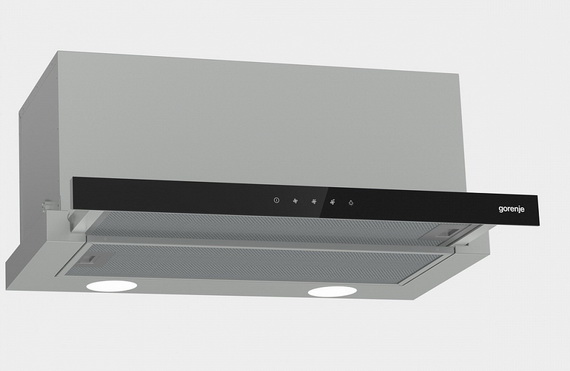 Встраиваемая телескопическая вытяжка Gorenje TH60E8SGB в цвете нержавеющей стали с черным стеклом гармонично вписывается в интерьер кухни, а компактные размеры позволяют установить ее в шкаф, что делает вытяжку практически незаметной.