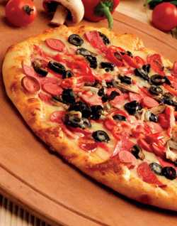 Начинка пиццы зависит только от вашей фантазии. Если в доме есть мужчина, то ему точно придется по вкусу пицца с тремя видами мяса: полосками итальянской салями, пепперони и пармской ветчины. Сверху положите черные маслины и кусочки сыра моццарелла. Готово!