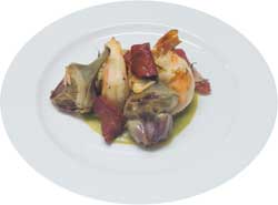 Ингредиенты: гигантские креветки, артишоки, помидоры, розмарин, тимьян, чеснок, зеленый горошек, оливковое масло, соль.
