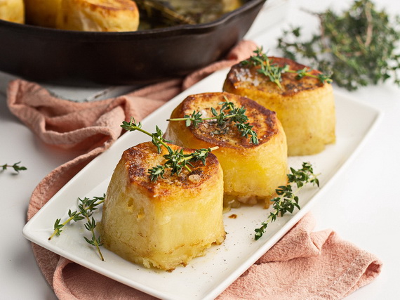 Картофельный фондан получил свое название от французского «Pomme de terre fondante», что переводится как «тающий картофель». Фондан – метод приготовления, когда продукт (в нашем случае сладкий картофель) сначала обжаривается, а затем доводится до готовности в духовке со сливочным маслом и бульоном. Картофель получается нарядным, с хрустящей корочкой сверху и нежнейшим внутри.