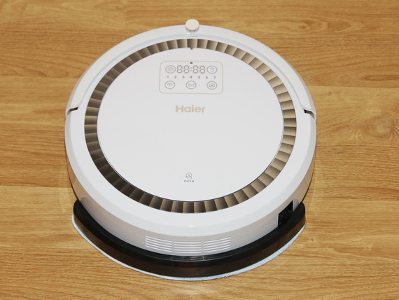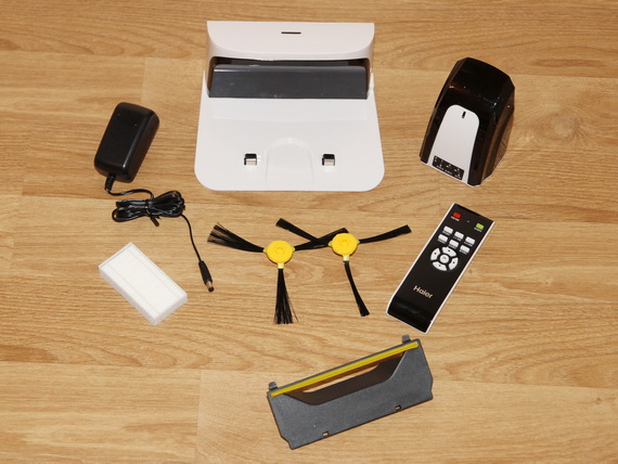 На переднем плане салфетка для влажной уборки из микрофибры, сразу за ней (над шильдиком Haier) – ультрафиолетовая антибактериальная лампа, далее резиновый скребок, основная антистатическая щетка и две вспомогательные щетки, направляющие на нее пыль. Для передвижения пылесоса имеются два колеса на подпружиненной подвеске и передний поворотный ролик. Максимальный уклон поверхности, по которой может двигаться робот составляет 25°, максимальная высота препятствия – 15 мм.