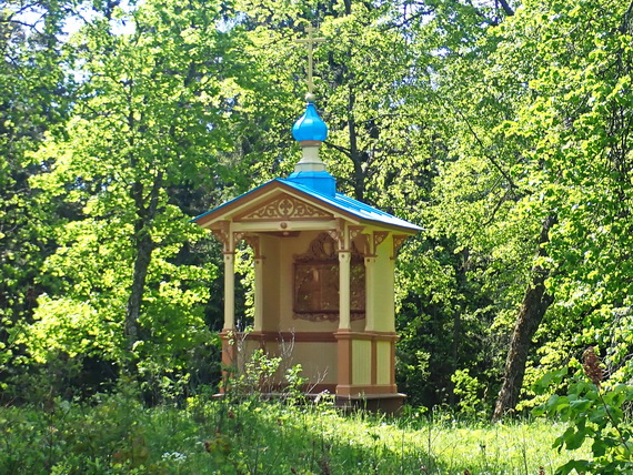Перед тем, как спуститься по гранитным ступеням к Монастырской бухте, осматриваем мраморно-гранитную часовню-сень в честь иконы Божией Матери «Знамение». Это массивное сооружение в русском стиле было построено недалеко от Святых врат в честь посещения монастыря императором Александром II в 1858 г.