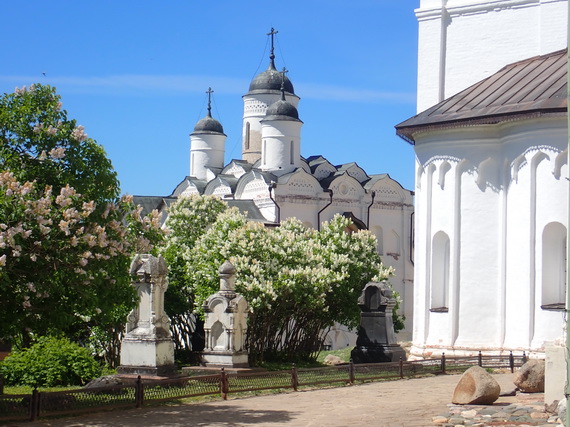 За пышными кустами сирени у белых стен этого храма видна трехглавая Преображенская церковь, возведенная в 1595 г. над Водяными воротами, которые служили парадным входом в монастырь со стороны Сиверского озера.