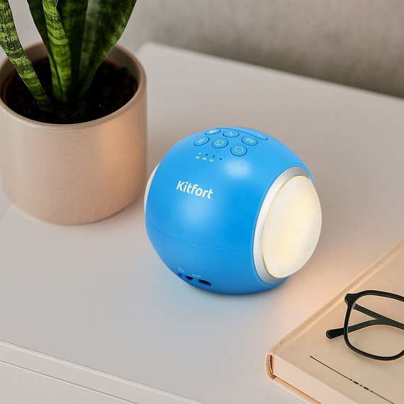 Kitfort КТ-3757 – генератор белого шума со спектром частот от 150 до 20000 Гц. Помимо генерации звука, он выполняет функцию ночника с возможностью включения цветной подсветки. При помощи кнопок на корпусе можно настроить таймер (от 30 до 90 минут) или задать непрерывный режим работы, установить один из трёх уровней подсветки и выбрать воспроизводимый прибором звук (белый шум, вентилятор или естественные звуки).