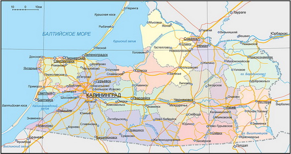 Речь идет о Калининградской области – самой маленькой в России. Её максимальная протяжённость с запада на восток – 205 км, с севера на юг – 108 км. Местное время отличается от московского времени на −1 час.