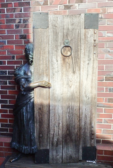 Еще одна скульптура: женщина-трактирщица, выглядывающая из-за приоткрытой двери