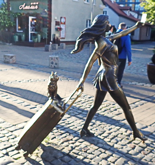 Открытая в 2020 г. скульптура «Курортница» (или «Туристка») изображает девушку, которая на ходу делает селфи на смартфон. На её чемодане сидит кот – символ Зеленоградска.