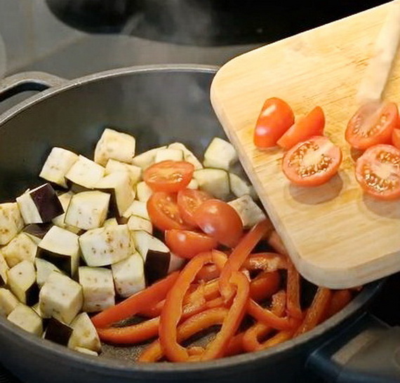 На другой сковороде слегка обжарьте баклажаны, перец и черри.