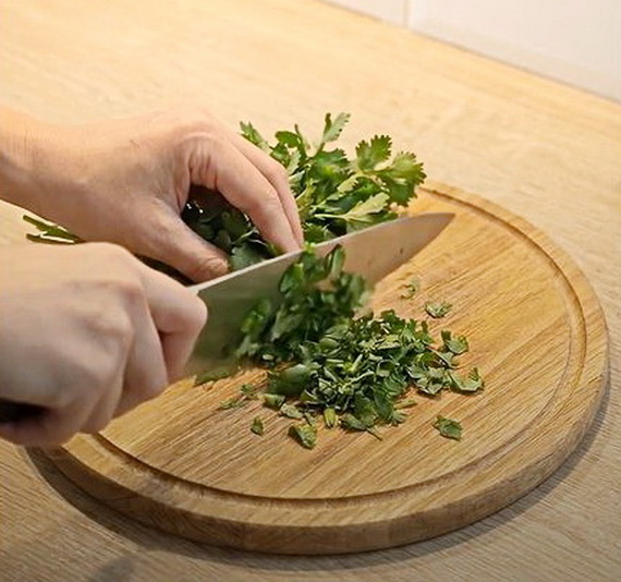 В растительное мало добавьте сок лимона и порубленный чеснок, затем нарежьте зелень.